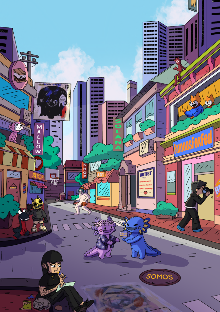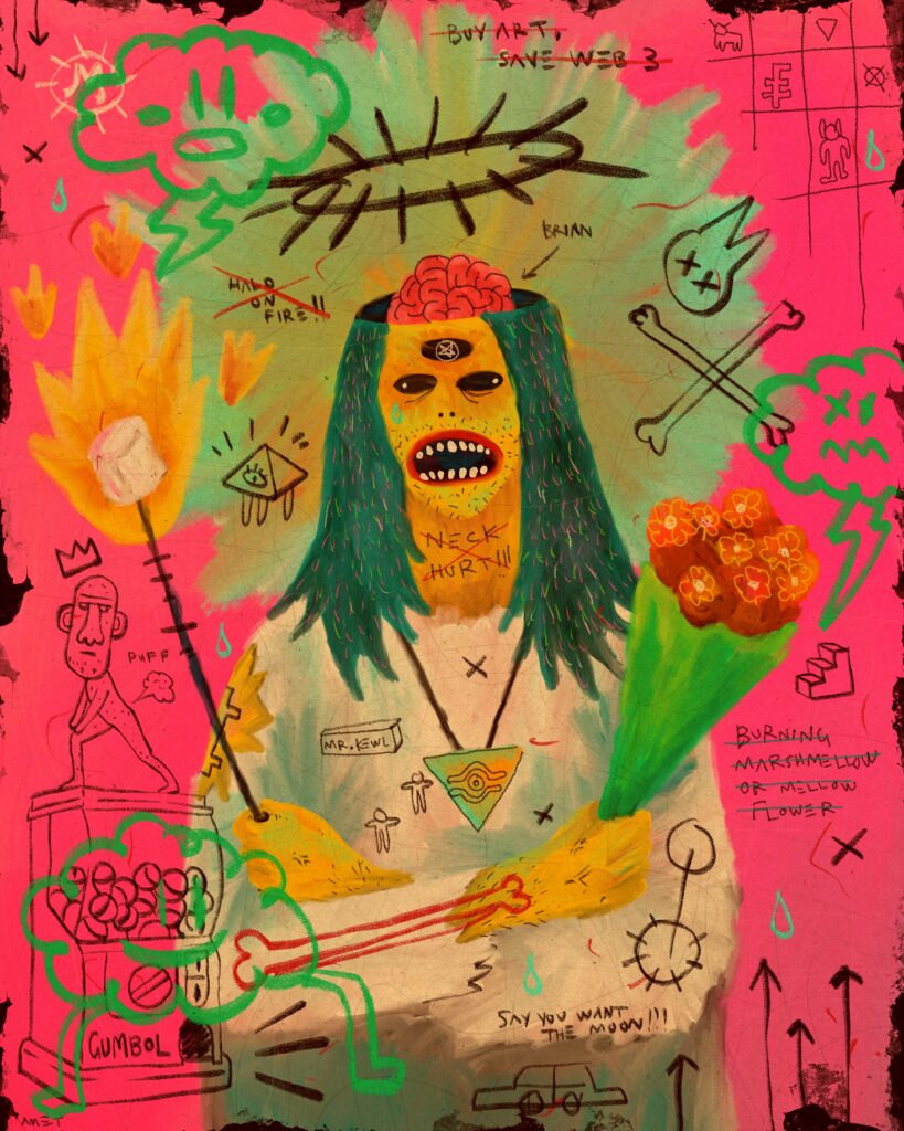 “Marsh/Mallow” shows a guy torn between burning marshmallow or holding mallow flowers, mirroring artist debating minting work without sales or simply creating freely, stuck overthinking every move, feeling uncertain yet…